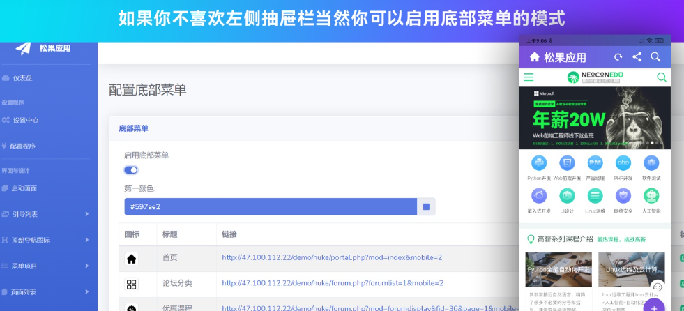 添加或者编辑底部菜单或者悬浮按钮等等,当用户点击相关的栏目会跳转到你设置的相关链接。当然我们也提供了视频教程你可以按照视频教程一步一步的部署即可